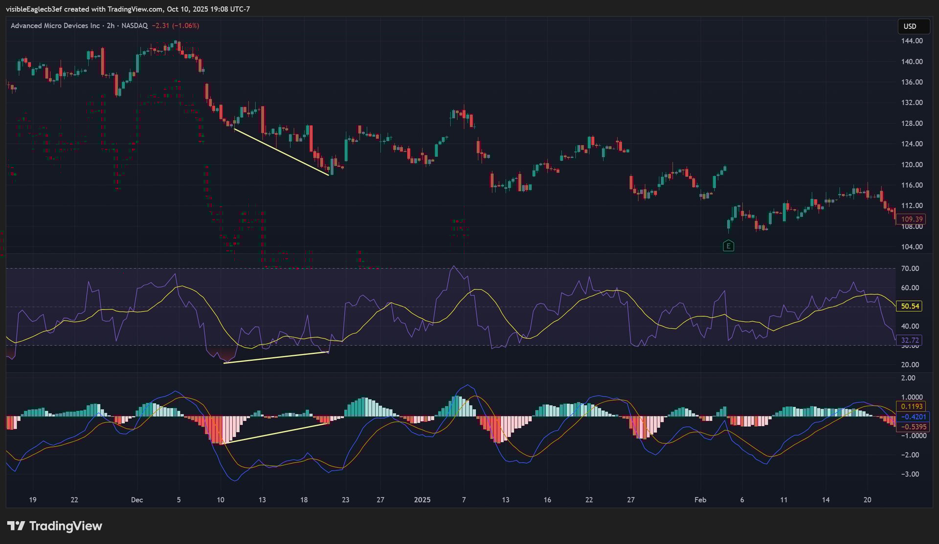 In the case of AMD, we examine the indicator performance on a two-hour chart. A bearish MACD and RSI divergence was formed in December 2023. Again, a complete failure.