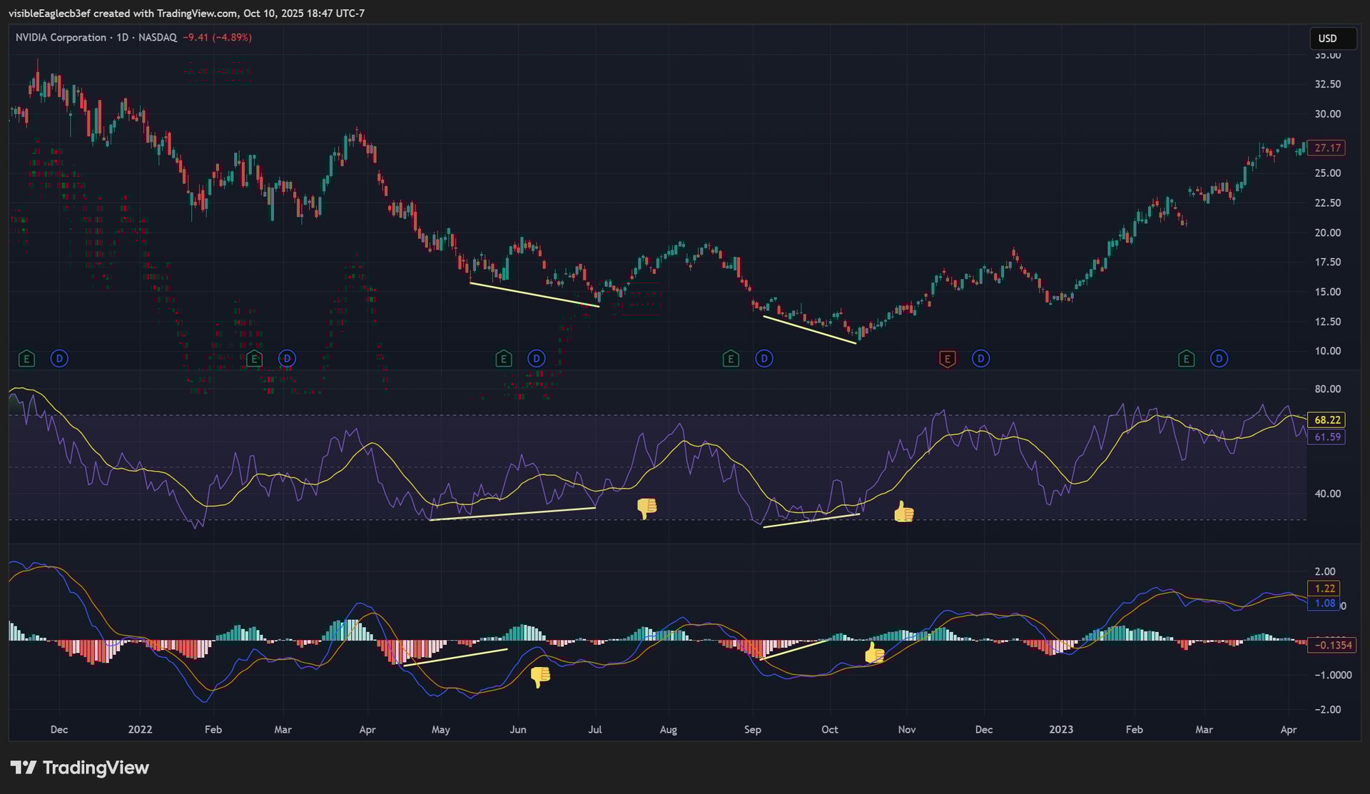 Let's examine the real-world performance of MACD and RSI divergences in two major tech stocks, NVIDIA (NVDA) and AMD. On the NVDA chart, we see a telling contrast between two periods. In May 2022, both the MACD and RSI developed clear bullish divergences—where prices made a lower low, but the indicators formed a higher low. This classic signal incorrectly forecasted a reversal, as the stock continued its steep decline in the face of broader macroeconomic pressures. Just a few months later, however, in October 2022, a nearly identical setup of bullish divergences in both indicators successfully marked the true bottom, preceding a massive multi-year rally. A similar story played out with AMD. In June 2023, a promising bullish divergence failed, giving way to further correction. Yet, by September 2023, a new divergence pattern accurately foreshadowed a significant upward trend.